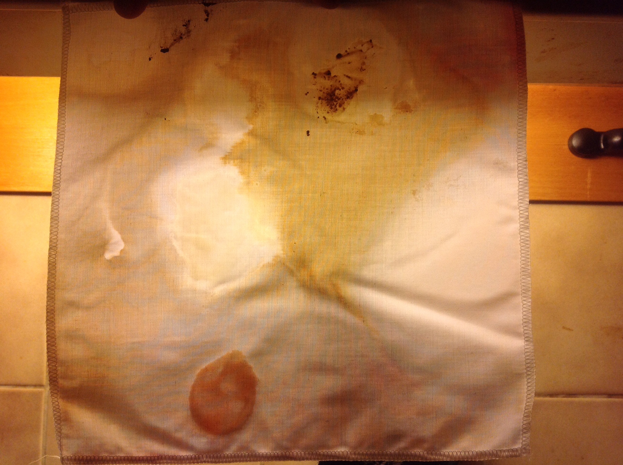Jag började testet genom att på tygtrasan applicera fläckar av: kaffe med mjölk och grädde, te med citron, julmust, ketchup, senap, japansk soja, rödvin, svart vinbärssaft, honung, sirap och rapsolja.