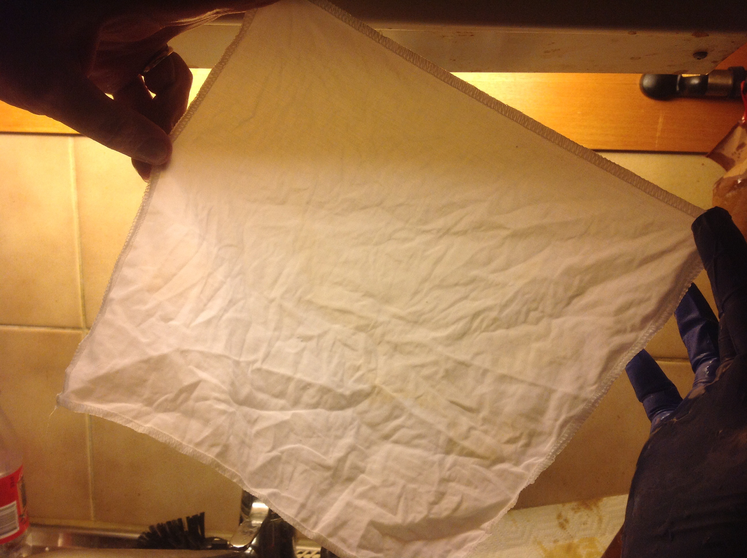 Eller, nåja, ska jag vara ärlig så syns fortfarande svagt gula fläckar efter kaffet och julmusten om man tittar noga i genomlysning, men det kan faktiskt bero på att jag inte haft tillgång till tvättmaskin utan tvättat för hand mellan behandlingarna .
